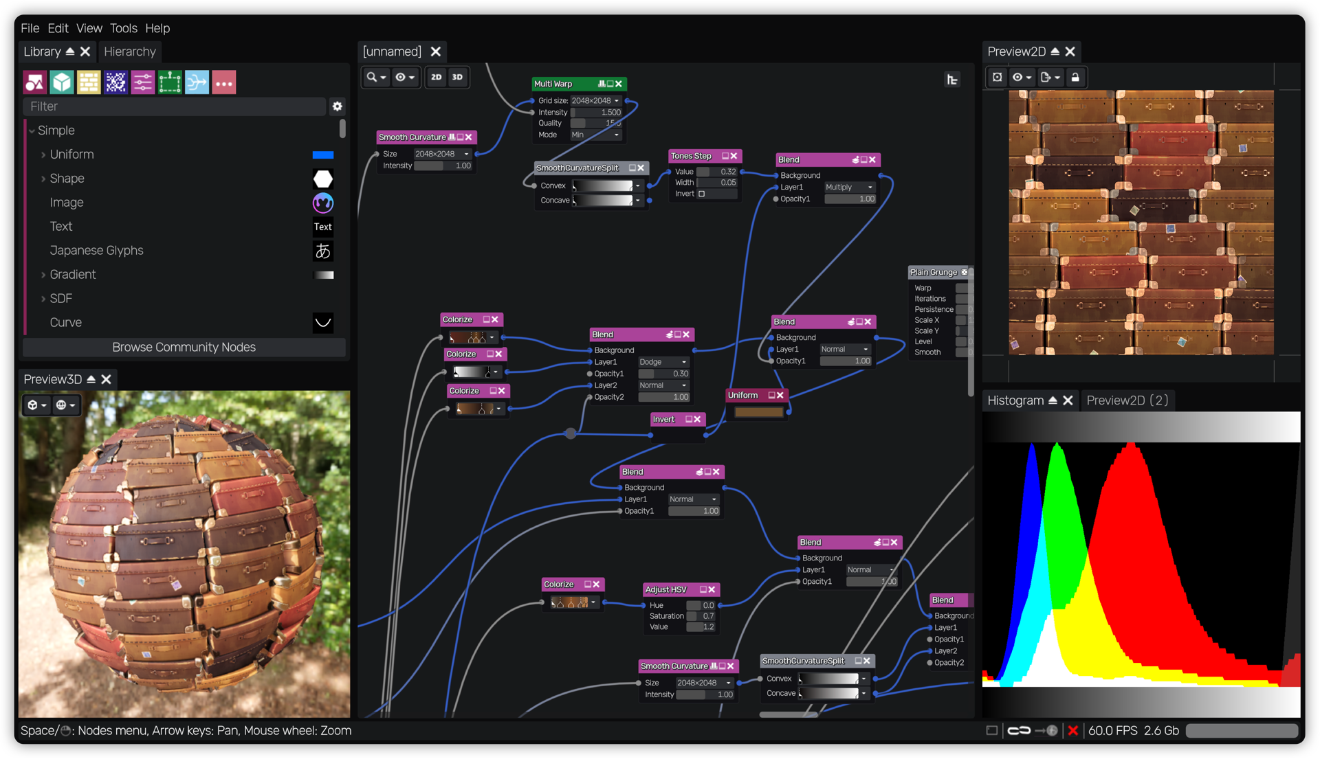 - A base library of ~250 nodes that define shapes, patterns, filters and transforms on textures, as well as 2D and 3D shapes described as signed distance functions. Those nodes can be accessed from the Library panel or the nodes context menu of the graph view.
